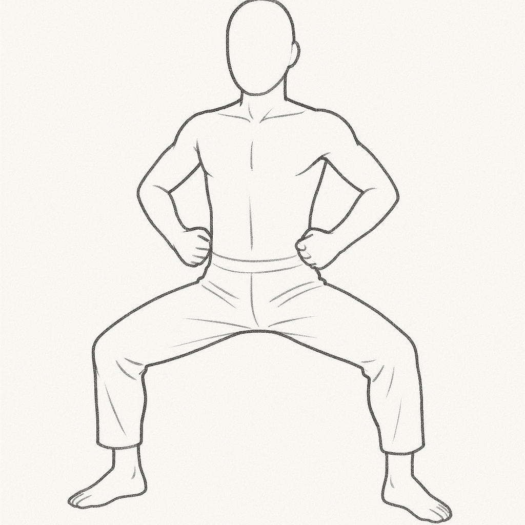 말 타기 자세. 넓게 스쿼트하는 자세로 보면 되고, 스플릿(균형 잡는 운동)이다. 엉덩이, 허벅지, 허리 아래 근력과 유연성 개발. 레딧에서 참조. 일주일에 4일, 1분 유지 * 3~5 진행. 참조 비디오는 여기.
